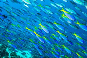 Fusiliers rushing by me at Sardine Reef. 50% of the sales are donated to local conservation efforts in Raja Ampat.